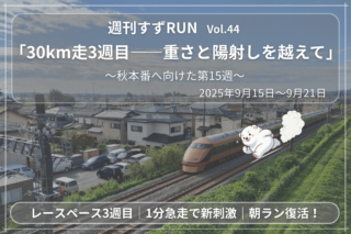 週刊すずRUN|練習記録 【週刊すずRUN Vol.44】30km走3週目――重さと陽射しを越えて|2025/9/15〜9/21【練習記録】 0km走3週目に挑戦!厳しい陽射しの中でも粘りを見せた第15週。レースペースインターバルや1分急走、朝ラン復活など、多彩な練習で本番に向けて着実に力を積み重ねています。 2025.09.27 週刊すずRUN|練習記録