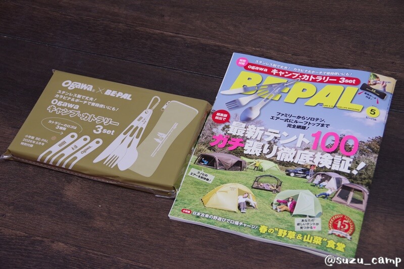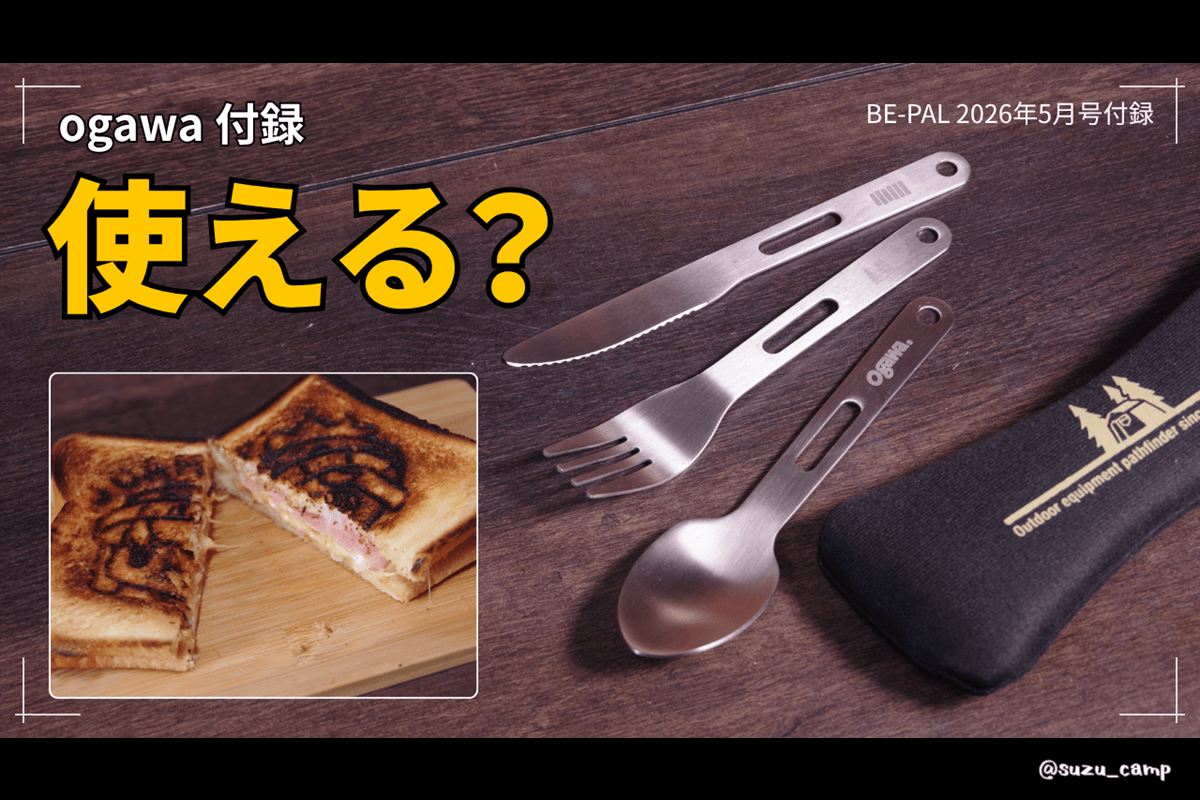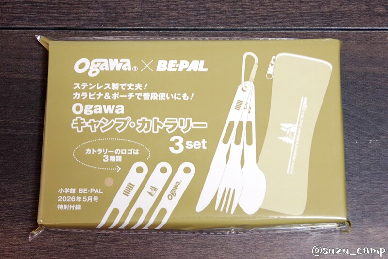 BE-PAL 2026年5月号の付録は、ogawaキャンプ・カトラリー3点セット。今月号はナイフ・フォーク・スプーンに加えて、ポーチとカラビナまで付いた、使う場面をイメージしやすい内容となっていました。