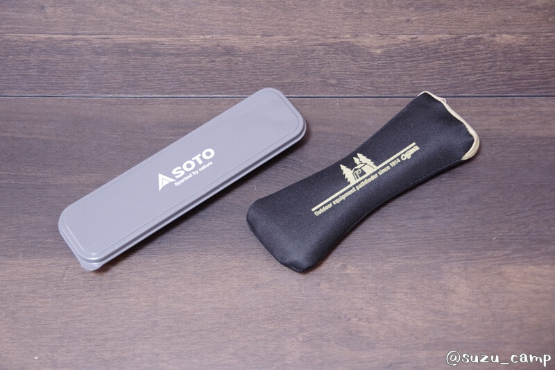 収納方法は、前回のエコSOTOカトラリーのようなケース式ではなく、ポーチ+カラビナの組み合わせです。この構成は見た目にもわかりやすく、「使い終わったらまとめて入れておく」という使い方がしやすそうでした。ケース収納のカチッとした感じとは少し違いますが、気軽に持ち出したい付録としては、このラフさも悪くありません。