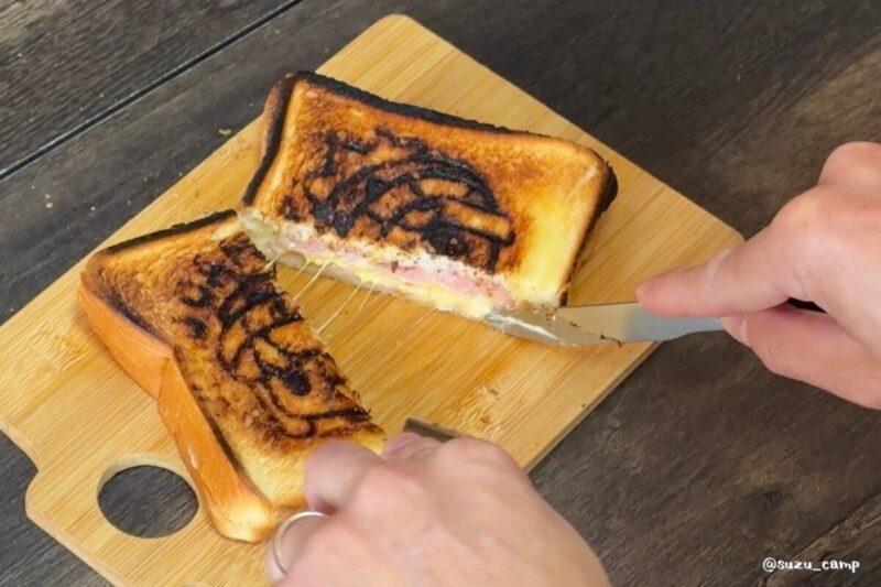 見た目や数値を確認したうえで、次は実際の使い心地です。今回はホットサンドを切ってみましたが、ここでいちばん感じたのは、やはりナイフが入っている意味でした。