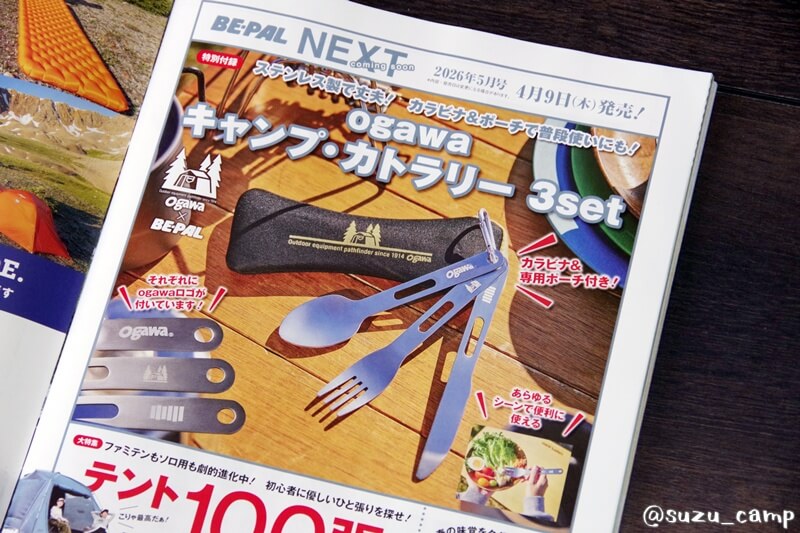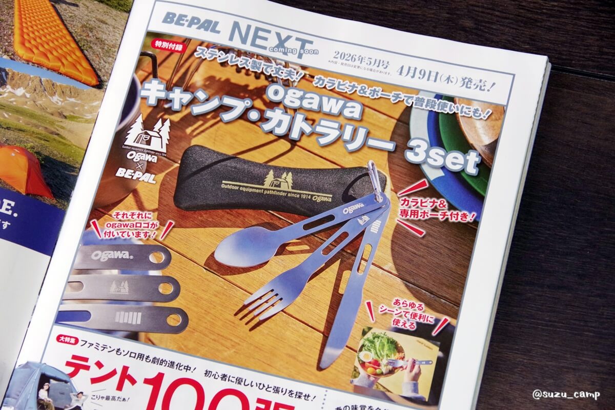 BE-PAL 2026年5月号の付録は、「ogawa キャンプ・カトラリー3点セット」!