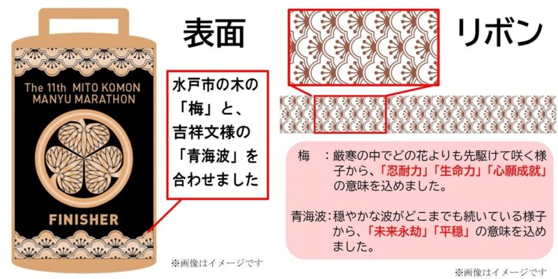 そしてもうひとつ気になるのが完走記念メダル。今年のメダルは、水戸黄門の印籠をかたどったデザインがベース。水戸市の木「梅」と吉祥文様の「青海波」を組み合わせた柄も入り、水戸らしさのある仕上がりになっています。