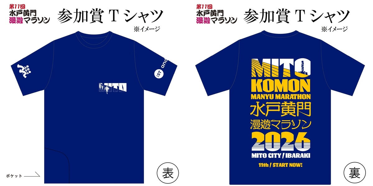 まず参加賞Tシャツは事前発送。公式では、水戸の歴史と誇りを大胆なタイポグラフィで表現したデザインと紹介されています。MITOの「O」には水戸芸術館のシンボルタワーを象徴的に配置し、朝焼けのようなイエローで走る高揚感を表した一枚とのことです。