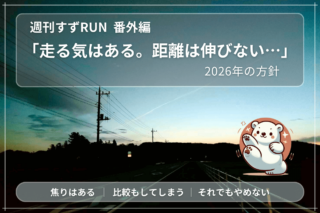 週刊すずRUN|練習記録 【週刊すずRUN 番外編】走る気はある、距離は伸びない。それでも、またここから|2026年の方針 走る気はあるのに、距離が伸びない。そんな12月を経て、年明けに考えた2026年の方針を正直に綴りました。焦りも迷いもあったけれど、やめてはいない。週刊すずRUN番外編。 2026.01.03 週刊すずRUN|練習記録